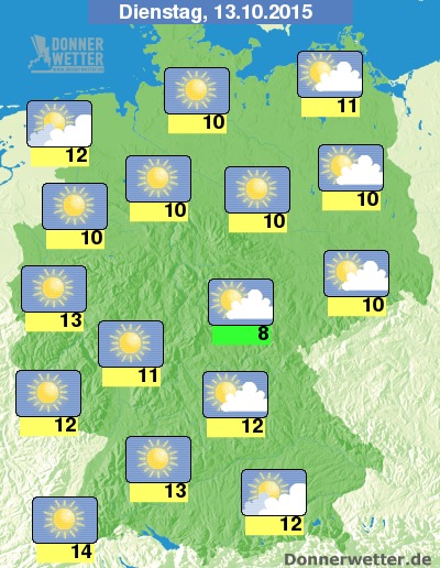 Am Donnerstag über der Südhälfte meist sonnig, sonst teils heitere Abschnitte, teils einige Wolken, trocken, 8 bis 14 Grad.