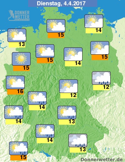 Heute zeigt sich das Wetter über der Nordhälfte des Landes verbreitet heiter oder sonnig, nur gebietsweise sind hier mehr Wolken möglich, dazu bleibt es trocken. Vom Süden bis nach Sachsen hin ziehen jedoch oft dichte Wolken durch und es bilden sich gebietsweise Schauer, vereinzelt sind auch Gewitter möglich. Die Temperatur steigt auf 12 bis 16 Grad.