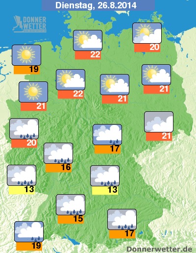 Der Dienstag wird in der Nordhälfte Deutschlands voraussichtlich weiterhin freundlich und trocken, weiter südlich ziehen jedoch verbreitet dichte Wolken auf und es fällt auch immer wieder teils kräftiger Regen. Bei anhaltendem Regen werden unter den dichten Wolken teilweise nur 13 Grad erreicht, in Hamburg steigt das Quecksilber etwa bis 22 Grad.