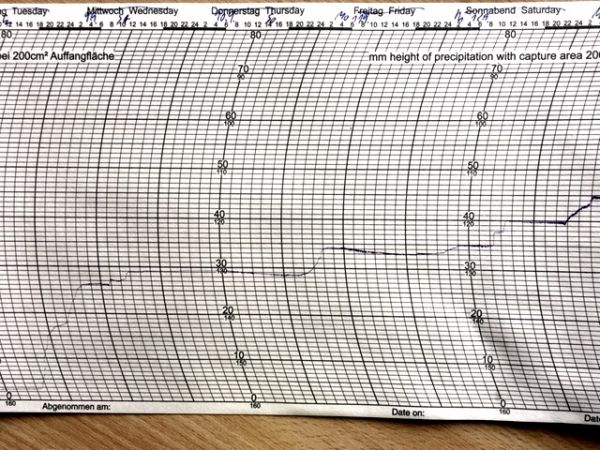Das zeigt auch der Schrieb unserer Niederschlagswaage, welcher hier den Zeitraum 09.09. bis 13.09. abbildet: