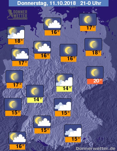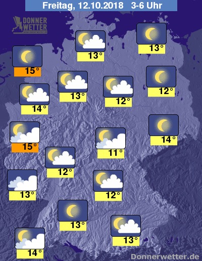 Während der zweiten Nachthälfte ziehen im Westen neue Wolkenfelder auf. Dort wo die Benelux Staaten nahe sind können auch einige Tropfen fallen. Sonst sollte es jedoch trocken bleiben und häufig funkeln die Sterne. Mit Frühwerten von 10 bis 15 Grad bleibt es für Mitte Oktober ungewöhnlich mild.