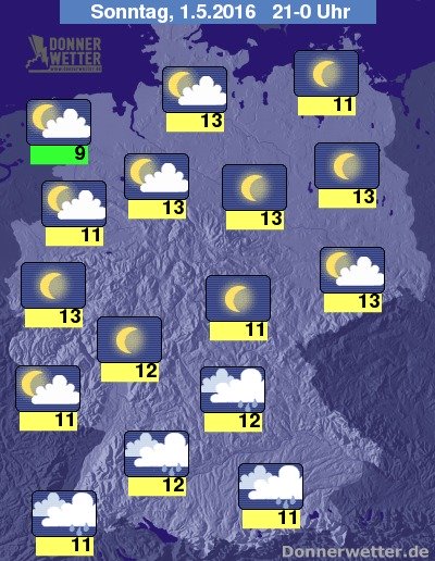 Heute Abend ziehen sich die dichten Regenwolken immer weiter zum Alpenrand hin zurück, jedoch bleibt es auch im übrigen Süddeutschland sowie in Sachsen meist stark bewölkt, jedoch trocken. Im Nordwesten und Norden ziehen meist lockere Wolkenfelder übers Land, sonst ist es hingegen sternenklar, dabei bleibt es trocken. Die Abendtemperatur liegt bei 13 Grad in Hoyerswerda und etwa 9 Grad in Papenburg.