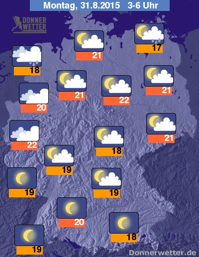 In der folgenden Nacht bleibt es im Süden Deutschlands weitgehend sternenklar und dazu trocken. Im Westen, Nordwesten und Norden des Landes ziehen hingegen zeitweise dichte Wolken auf und es können sich teils kräftige Schauer und Gewitter bilden. Im übrigen Bundesgebiet ist es verbreitet leicht oder locker bewölkt und trocken. Die Temperatur sinkt auf tropische 22 Grad in Magdeburg und bis 17 Grad an der Müritz.