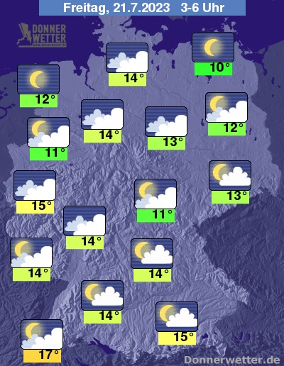 In der Nacht zum Freitag ist der Himmel meist locker bis aufgelockert bewölkt, im Norden klart es im Verlauf meist auf. Im Süden können zeitweise dichte Wolken auch einzelne Schauer bringen, sonst bleibt es weitgehend trocken. Die Temperatur sinkt auf 17 Grad in Freiburg und bis 10 Grad in Neubrandenburg.