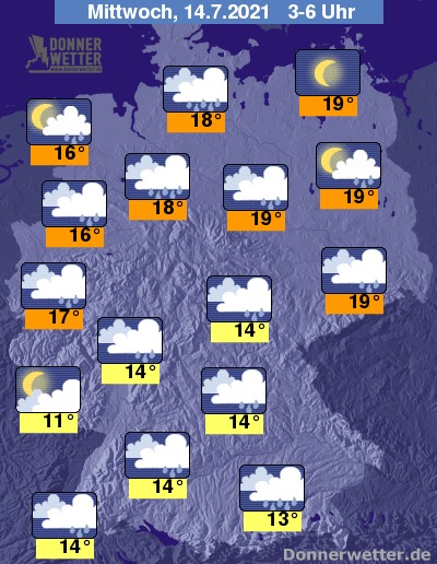 In der bevorstehenden Nacht fällt bei überwiegend dichten Wolken verbreitet, zum Teil langanhaltender, ergiebiger und gewittriger Regen. Im Küstenumfeld ist es auch oft locker bewölkt oder sternenklar, hier bleibt es weitgehend trocken. Die Temperatur sinkt auf 19 Grad in Berlin und bis 11 Grad in Saarbrücken.