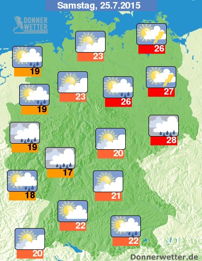 Heute kann sich vor allem im Süden zwischen den Wolken häufig die Sonne zeigen, hier sind gebietsweise aber auch Schauer möglich, sonst ist es überwiegend stark oder wechselnd bewölkt und es bilden sich zum Teil kräftige Schauer und besonders in den Küstengebieten sowie im Osten des Landes auch einzelne Gewitter. Die Temperatur steigt auf kühle 17 Grad am Westerwald und bis auf schwülwarme 28 Grad in Dresden. Der Wind weht dabei zunehmend stark bis stürmisch, im Norden und Westen herrscht zum Teil sogar Sturm, dabei sind schwere Sturmböen möglich.