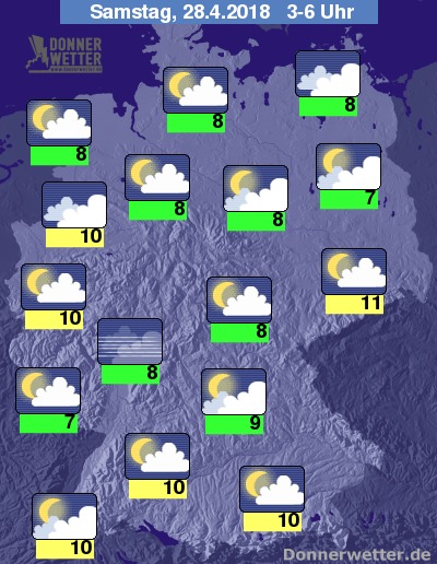 In der folgenden Nacht ist im Nordseeumfeld gebietsweise Regen möglich, sonst klingen die Niederschläge im Norden meist ab und es bleibt weitgehend trocken. Von der breiten Landesmitte bis nach Süden zeigt sich der Himmel meist locker bis wechselnd bewölkt, zum Teil auch sternenklar, dazu bleibt es trocken. Die Temperatur sinkt auf 11 Grad in Dresden und bis 7 Grad im Saargau.
