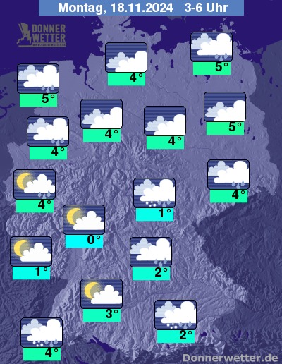 In der Nacht zum Montag ist der Himmel meist stark bewölkt, Wolkenlücken beschränken sich vor allem auf die westlichen und südwestlichen Landesteile. Verbreitet muss in den Nachtstunden mit Schauern gerechnet werden, im Bergland fällt oberhalb von 400 bis 500 m auch Schnee.