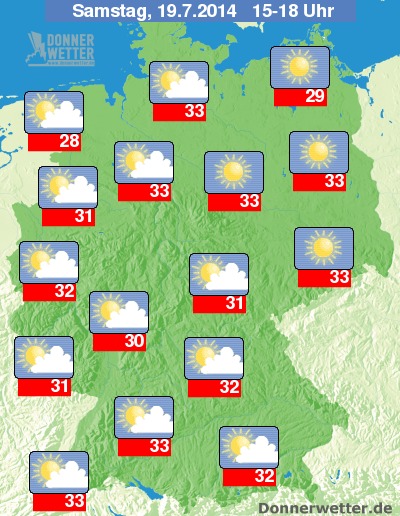 Heute Nachmittag scheint die Sonne vor allem im Norden und Osten von einem meist blauen Himmel, auch sonst ist es vielfach heiter, dabei ziehen aber hier und da schon einige Quellwolken auf, allerdings bleibt es auch hier weitgehend trocken. Die Temperatur liegt bei etwa 28 Grad an der Nordseeküste und 33 Grad in der Lausitz sowie im Oberrheingraben.