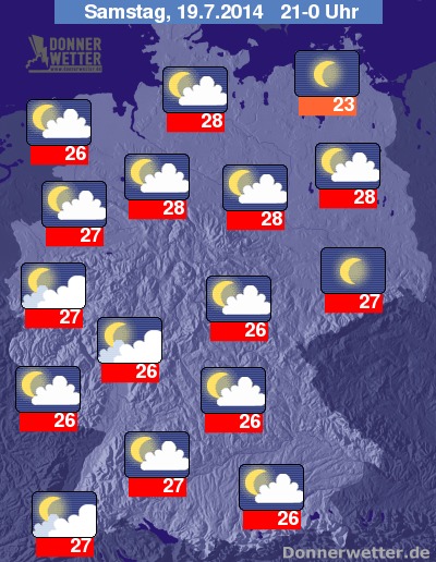 Am Abend ziehen auch in den Norden und Osten lockere Wolken, sonst ist es ebenfalls meist locker bewölkt und häufig zeigen sich auch die Sterne. Es bleibt trocken bei Abendwerten zwischen 27 Grad in Baden-Baden und 23 Grad an der Ostsee.