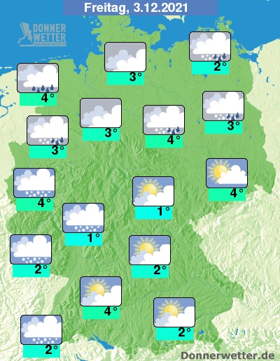 Am Freitag bleibt es überwiegend bedeckt, dabei fällt zunächst nur vereinzelt Schnee oder Schneeregen. Im weiteren Tagesverlauf zieht von Westen her zum Teil kräftiger Schnee oder Regen auf. Die Temperatur steigt auf 1 Grad in Erfurt und bis 4 Grad in Bonn.