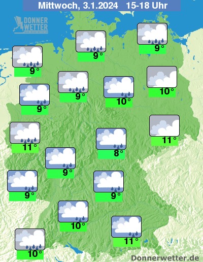 In den Nachmittagstunden bleibt der Himmel stark bewölkt oder es ist bedeckt, dabei muss verbreitet mit Schauern oder schauerartigem Regen gerechnet werden. Im Umfeld der Küsten kann es anfangs auch noch kräftiger regnen. Längere trockene Abschnitte sind bei gebietsweisen Auflockerungen vor allem in der Südosthälfte möglich.