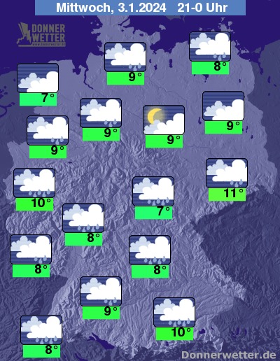 In der Nacht auf Donnerstag bleibt der Himmel stark bewölkt oder es ist bedeckt; dabei muss weiterhin verbreitet mit teils schauerartigem Regen gerechnet werden, vor allem auf einem Streifen vom Niederrhein bis in den Bayerischen Wald.