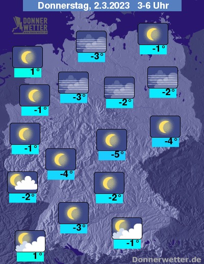 In der kommenden Nacht zeigt sich der Himmel größtenteils sternenklar, hier und da sind wenige, an den Alpen auch einige und zum Teil dichte Wolken möglich. Es bleibt trocken bei Tiefstwerten von 1 Grad in Cuxhaven und -5 Grad in Zwickau.