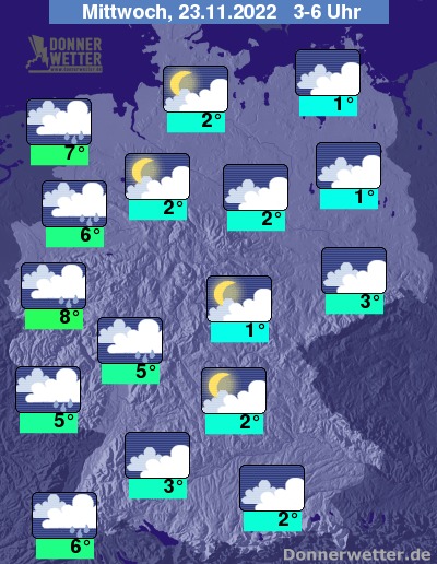 In der folgenden Nacht bleibt es überwiegend stark bewölkt oder bedeckt, stellenweise bildet sich Nebel. In den westlichen Landesteilen fällt vielerorts Regen, während es sonst trocken bleibt. Die Tiefstwerte liegen bei 8 Grad in der Kölner Bucht und 1 Grad in Jena.