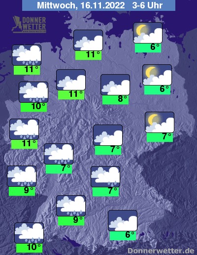 In der kommenden Nacht zieht es sich auch im Osten und Nordosten mehr und mehr zu, jedoch bleibt es hier bis zum Morgen noch weitgehend trocken. Im übrigen Land ziehen von Westen her dichte Wolken durch und es fällt zeitweise Regen. Die Temperatur sinkt auf 11 Grad in Köln und etwa 6 Grad in Berlin.