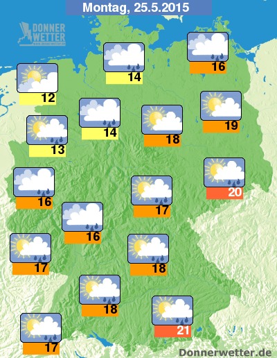 Heute zeigt sich der Himmel verbreitet wechselnd oder stark bewölkt, dabei fällt zeitweise Regen oder es bilden sich einzelne Schauer, im Süden und Osten auch mögliche Gewitter. Die Temperatur steigt auf kühle 12 Grad an der Nordsee und bis 21 Grad in München.
