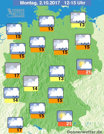 Heute Nachmittag bleibt es über Deutschland verbreitet stark bewölkt, nur über Bayern und Sachsen ist es anfangs noch meist aufgelockert bewölkt und trocken, sonst fällt hingegen zeitweise Regen. Die Temperatur steigt auf Werte zwischen 13 Grad im Grabfeld und etwa 21 Grad in der Lausitz.
