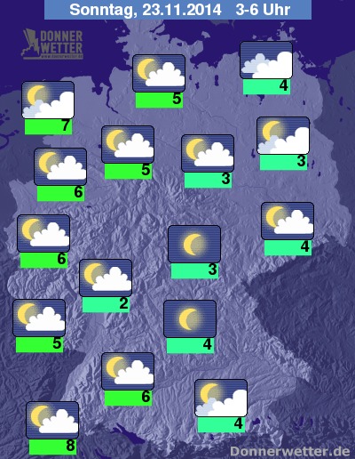 In der folgenden Nacht halten sich im Norden Deutschlands häufig dichte Wolken, aus denen es im Küstenumfeld hier und da etwas tröpfeln kann, sonst bleibt es trocken. Auch im Osten ist es oft stark bewölkt, jedoch trocken. In den übrigen Landesteilen ziehen meist lockere Wolkenfelder durch, hier und da wird es auch sternenklar, dazu bleibt es auch hier trocken. Die Temperatur sinkt auf rund 8 Grad im Breisgau und etwa 2 Grad im Westerwald.