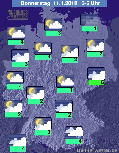 In der Nacht zum Donnerstag ziehen im Südosten dichte Wolken und etwas Regen oder Schneeregen auf, besonders im Norden ist es verbreitet nur leicht bewölkt oder sternenklar. Im übrigen Bundesgebiet zeigt sich der Himmel teils aufgelockert, teils stark bewölkt, dazu bleibt es trocken. Die Temperatur sinkt auf 6 Grad in Dresden und bis 1 Grad an der Müritz.