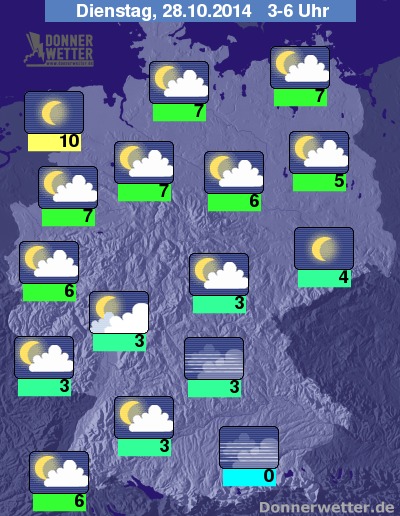 Die erste Nachthälfte zeigt sich überwiegend locker bewölkt; vor allem im äußersten Nordwesten kann es stellenweise auch aufklaren, entlang des Alpenrands ist örtliche Nebelbildung möglich.