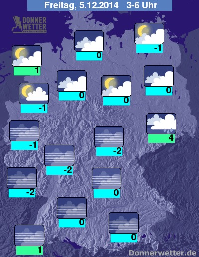 In der kommenden Nacht fällt in Norddeutschland unter überwiegend dichten Wolken noch hier und da etwas Regen, sonst ist es häufig neblig trüb oder bedeckt, zeitweise kann die Bewölkung aber auch mal etwas auflockern. Es bleibt trocken. Stellenweise bildet sich jedoch Nebel oder Hochnebel. Die Temperatur sinkt auf 4 Grad in Dresden und bis -2 Grad im Taunus.
