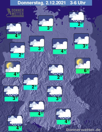 In der bevorstehenden Nacht ziehen oft dichte Wolken durch, es sind aber auch hier und da Auflockerungen möglich. Gebietsweise fällt Schnee, Schneeregen oder Regen. Die Temperatur sinkt auf 6 Grad in Dresden und bis 2 Grad in Wiesbaden. An der Ostsee weht anfangs noch ein stürmischer Wind, der zum Morgen hin aber mehr und mehr nachlässt.