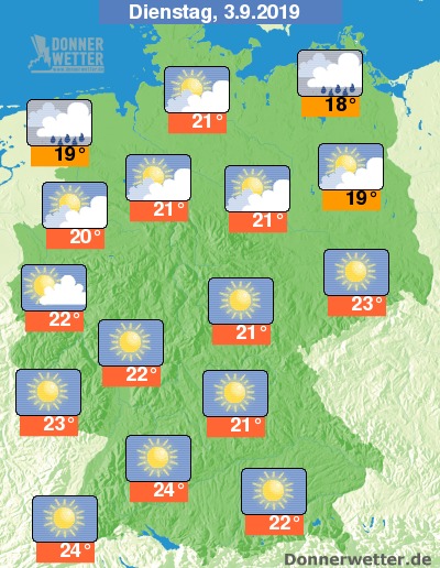 Die Tageshöchsttemperaturen liegen im Norden meist bei 17 bis 21 Grad, sonst werden verbreitet angenehme 21 bis 25 Grad erreicht.