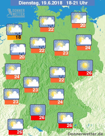 Heute Abend können sich im Nordwesten und regional über Thürigen noch einzelne Schauer entwickeln. Im übrigen Land ist es hingegen verbreitet heiter oder es ziehen einige, meist lockere Wolkenfelder durch, dazu bleibt es weitgehend trocken. Die Temperatur liegt bei eher kühlen 18 Grad in Cuxhaven und bis 26 Grad in Dresden.