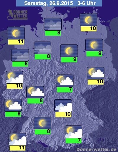 In der bevorstehenden Nacht bleibt es über der Nordhälfte Deutschlands verbreitet sternenklar, stellenweise kann sich hier jedoch Nebel oder Hochnebel bilden. Weiter nach Süden hin ist es zumeist locker bewölkt, vor allem im Süden und Südosten aber auch noch oft stark bewölkt, dazu bleibt es jedoch trocken. Die Temperatur sinkt auf 11 Grad im Breisgau und bis 8 Grad in der Lüneburger Heide.