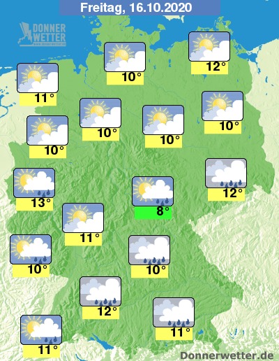 Die Höchsttemperaturen erreichen wie bereits schon in den letzten Tage herbstliche 8 bis 13 Grad, am wärmsten wird es dabei noch in den Ballungsgebieten des Westens.