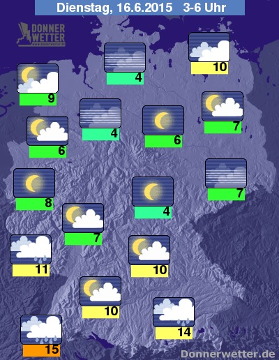 Die Temperaturen fallen auf 15 Grad C am Oberrhein und kühle 4 Grad C im Thüringer Wald.