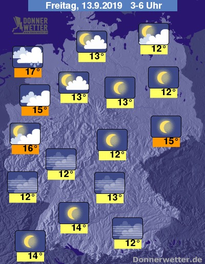 Während der zweiten Nachthälfte kann es im Küstenumfeld der Nordsee, sowie in Schleswig-Holstein zu Regenfällen kommen, auch im Westen können die Wolken etwas dichter werden. Sonst präsentiert sich der Himmel jedoch häufig sternenklar oder nur leicht bewölkt. In der Südhälfte können sich im weiteren Verlauf stellenweise Nebelfelder bilden.