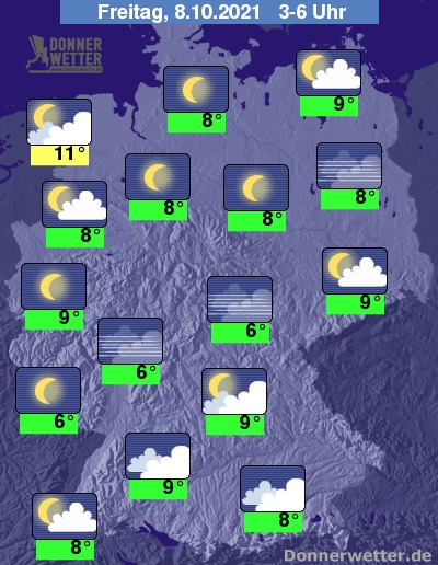 In der Nacht zum Freitag halten sich im Süden und vor allem im Südosten noch weitgehend dichte Wolken, dazu sind im Südosten auch noch einige Tropfen möglich. Im übrigen Land ist es verbreitet nur gering bewölkt oder sternenklar, dazu bleibt es trocken. Die Temperatur sinkt auf 11 Grad in Cuxhaven und bis 6 Grad in Wiesbaden.