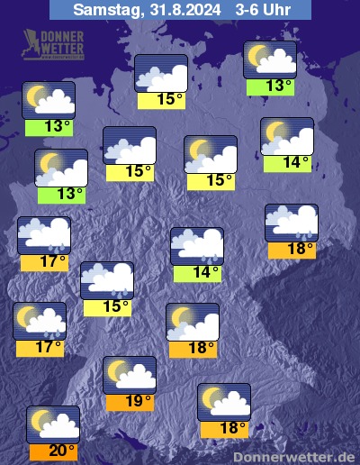 In der Nacht zum Samstag zeigt sich der Himmel auf einem Streifen vom Westen über Mitte bis in die Osthälfte stark bewölkt und es muss mit einzelnen Schauern gerechnet werden. Nördlich und südlich davon ist es meist wolkig, teils auch gering bewölkt, und es bleibt meist trocken.