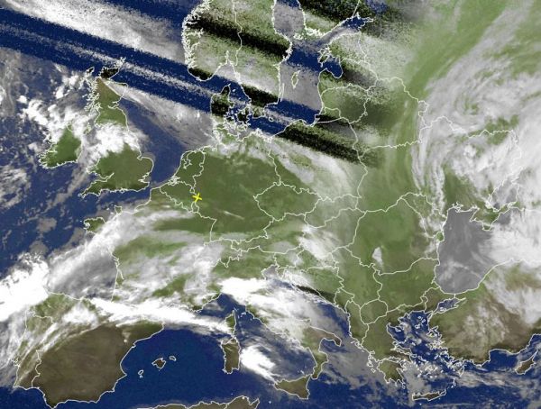 Das Satellitenbild von heute Morgen zeigt die Wolken atlantischer Tiefausläufer vom Westen und Norden der Iberischen Halbinsel, über Frankreich und über Teilen der Britischen Inseln. Hier herrscht verbreitet sehr nasses und teils stürmisches Wetter.