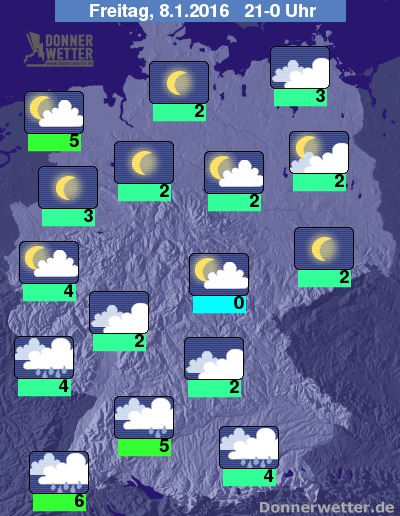 Heute Abend fällt im Süden sowie im äußeren Nordosten des Landes unter dichten Wolken zeitweise Regen. Sonst ist es über der Nordhälfte verbreitet sternenklar oder nur locker bewölkt und trocken. In den restlichen Landesteilen ist es zwar weitgehend stark bewölkt, jedoch trocken. Die Abendtemperatur liegt bei 6 Grad im Oberrheingraben und um 0 Grad im Vogtland.