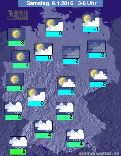 In der Nacht zum Samstag fällt im Süden unter dichten Wolken zum Teil langanhaltender und ergiebiger Regen. Von der breiten Mitte der Republik bis in den Norden des Landes ist es hingegen meist sternenklar oder nur locker bewölkt. Oft stark bewölkt ist es jedoch im Ostseeumfeld, es bleibt aber auch hier trocken. Die Temperatur sinkt auf 6 Grad in Freiburg und bis -2 Grad in Berlin.