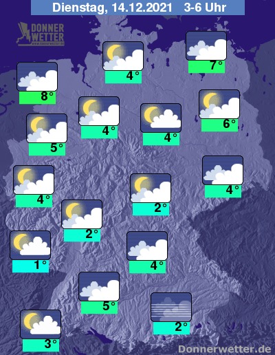 In der kommenden Nacht ist der Himmel überwiegend stark, gebietsweise auch etwas aufgelockert bewölkt. Vor allem im Süden bildet sich stellenweise Nebel. Es bleibt weitgehend trocken bei Tiefstwerten von 8 Grad an der Nordsee und bis 1 Grad am Pfälzer Wald.