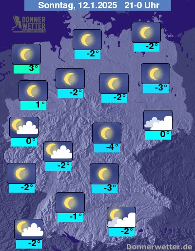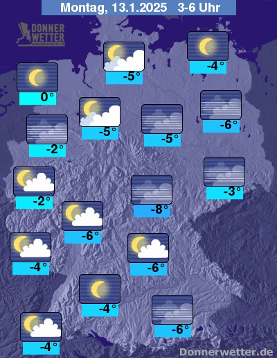Die Temperaturen gehen in den frühen Morgenstunden zurück auf Werte um 0 bis -8 Grad.
