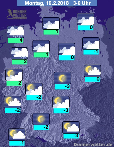Grau und nasskalt startet die neue Arbeitswoche dann vor allem in der Nordwesthälfte. Regional muss mit Glätte und Beeinträchtigungen im Berufsverkehr gerechnet werden. Freundlicher startet am Montagmorgen der Süden in den Tag, hier bleibt es bei wechselnder Bewölkung meist trocken.