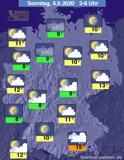 In der Nacht zum Sonntag fällt im Südosten unter dichten Wolken zeitweise Regen. In Nordseenähe ziehen ebenfalls dichte Wolken durch und hier bilden sich zeitweise Schauer. Im übrigen Land ist es sternenklar oder nur locker bewölkt, dazu bleibt es trocken. Die Temperatur sinkt auf 15 Grad in München und bis 8 Grad am Westerwald.