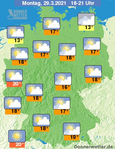 Heute Abend ist es überwiegend heiter bis sonnig. Mehr und teils dichte Wolken halten sich vor allem im Ostseeumfeld, aber auch über Ostdeutschland. Es bleibt landesweit trocken bei Höchstwerten von 13 Grad an den Küsten und bis 20 Grad am Rhein.