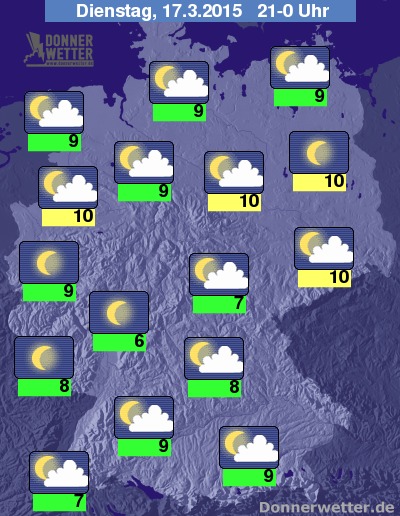 Heute Abend zeigt sich der Himmel im Westen meist sternenklar oder nur leicht bewölkt, in den anderen Landesteilen zieht dagegen meist lockere bis aufgelockerte Bewölkung durch. Es bleibt trocken. Die Abendwerte liegen bei 10 Grad in Magdeburg und um 6 Grad im Westerwald.