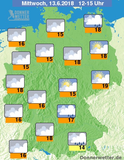 Heute Nachmittag fällt im Südosten unter dichten Wolken zeitweise Regen. Im übrigen Bundesgebiet ist es oft stark, hier und da auch mal aufgelockert bewölkt, dazu bleibt es bis auf wenige Ausnahmen im Ostseeumfeld trocken. Die Temperatur liegt bei 14 Grad in Rosenheim und bis 19 Grad in der Lausitz.
