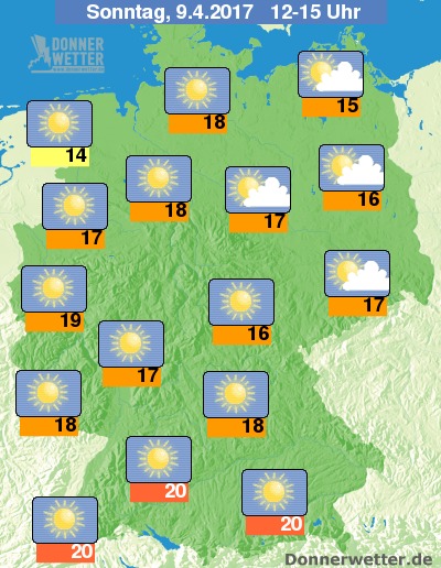 Heute Nachmittag scheint die Sonne größtenteils von einem stahlblauen Himmel, nur hier und da und vor allem im Osten und Nordosten ziehen lockere Wolkenfelder durch, dazu bleibt es trocken. Die Temperatur liegt bei 14 Grad an der Nordsee und um 20 Grad in Stuttgart und München.