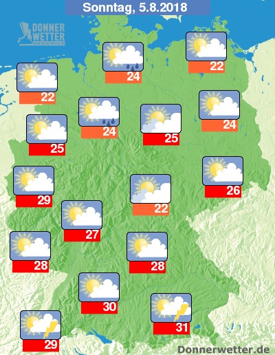 Heute ist es überwiegend heiter bis sonnig, am Alpenrand und im Norden ziehen gebietsweise auch dichte Wolken auf, dabei bilden sich vereinzelt Schauer oder Gewitter, sonst bleibt es aber trocken. Die Temperatur steigt auf rund 22 Grad an den Küsten und bis 31 Grad in München.