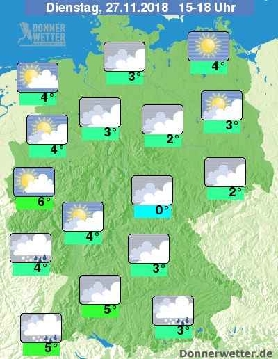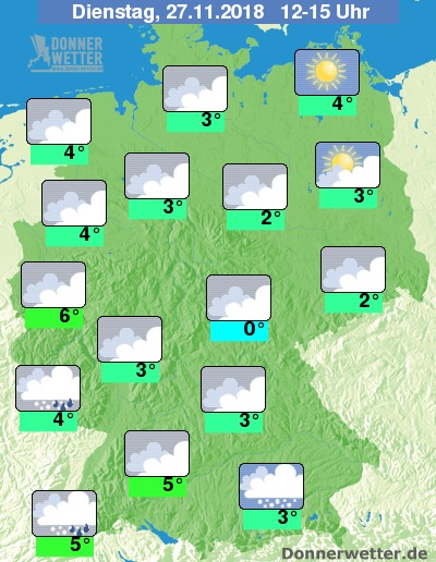 Am frühen Nachmittag fällt hauptsächlich im südlichen Schwarzwald, sowie im Alpenvorland je nach Höhenlage noch etwas Regen oder Schnee. Sonst präsentiert sich der Himmel in seinem tristen Einheitsgrau. Die größten Chancen auf Sonne bestehen in Teilen Brandenburgs, sowie Mecklenburg-Vorpommerns.
