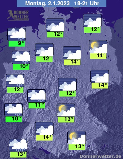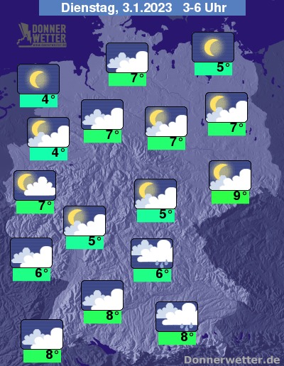 In der Nacht zum Dienstag bleibt es im Süden und zum Großteil auch im Osten stark bewölkt bis bedeckt, dazu ist auch etwas Regen möglich. Im übrigen Land ist es teilweise noch stark, oft jedoch auch locker bis aufgelockert bewölkt, dazu bleibt es weitgehend trocken. Die Temperatur sinkt auf 9 Grad in Dresden und 4 Grad in Emden.