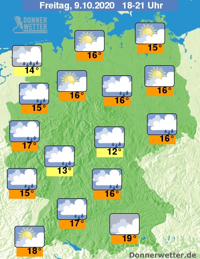 Am Abend fällt vor allem über den mittleren Landesteilen gelegentlich Regen. Im Norden spendet teilweise die untergehende Sonne noch etwas Helligkeit und Wärme, bevor von der Nordsee her neue Regenwolken aufziehen. Auch im Süden gibt es stellenweise noch einige Auflockerungen.